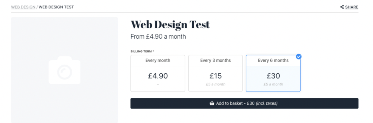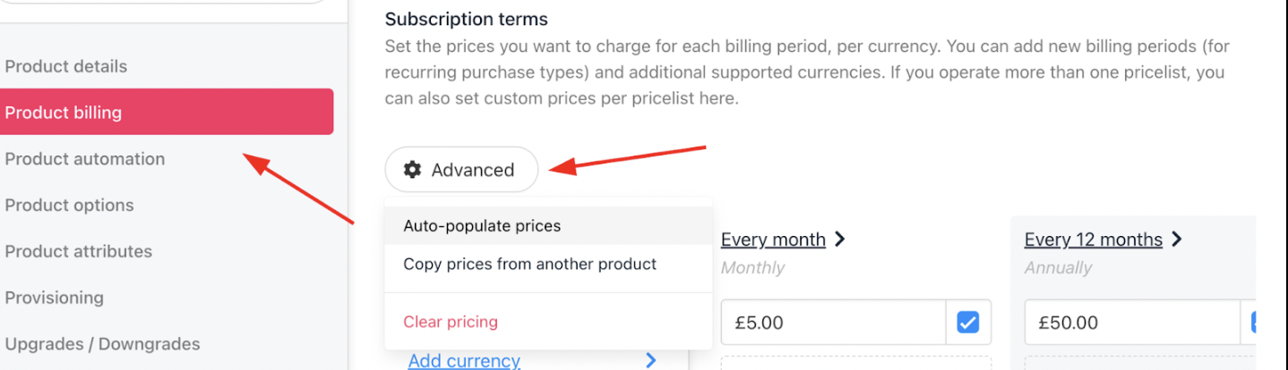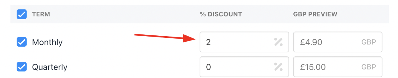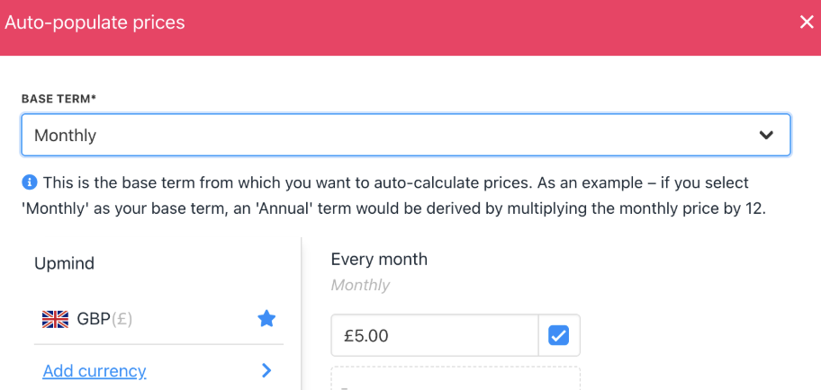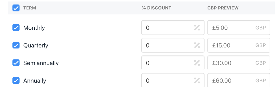 Example: Setting £5/month will auto-calculate £60/year for annual term.