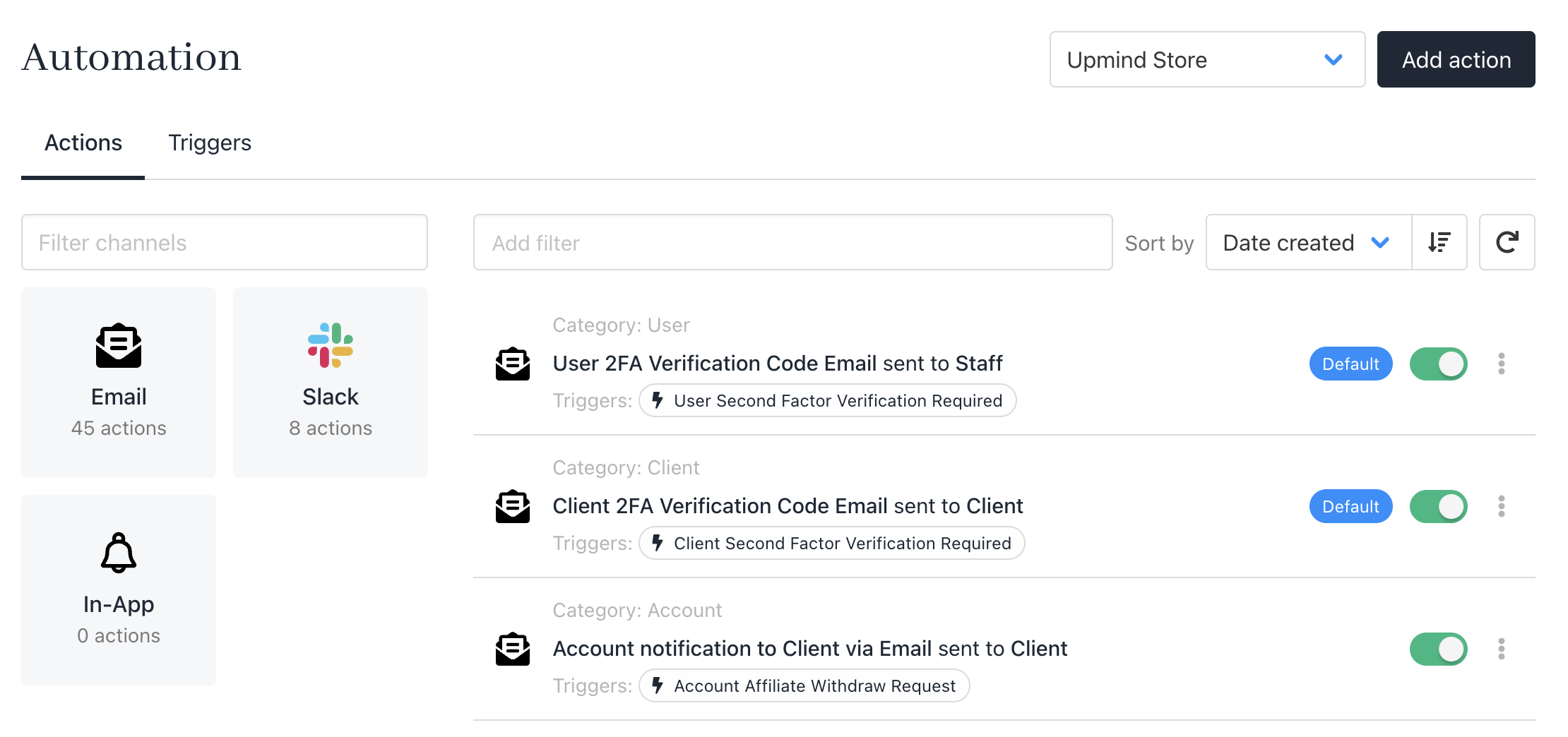 These notifications can be disabled and replaced in the admin area under Settings > Actions. All pre-generated templates are highlighted as Default.