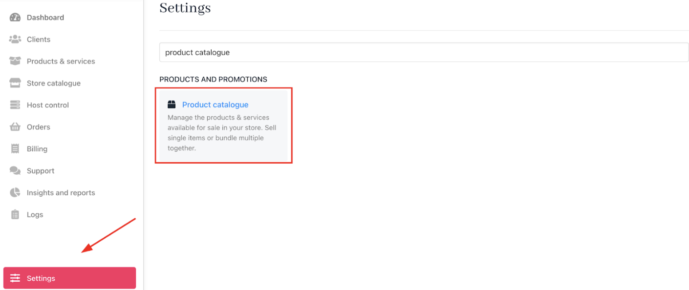 - You can also click Settings and select the Product Catalogue tile under Products and Promotions.