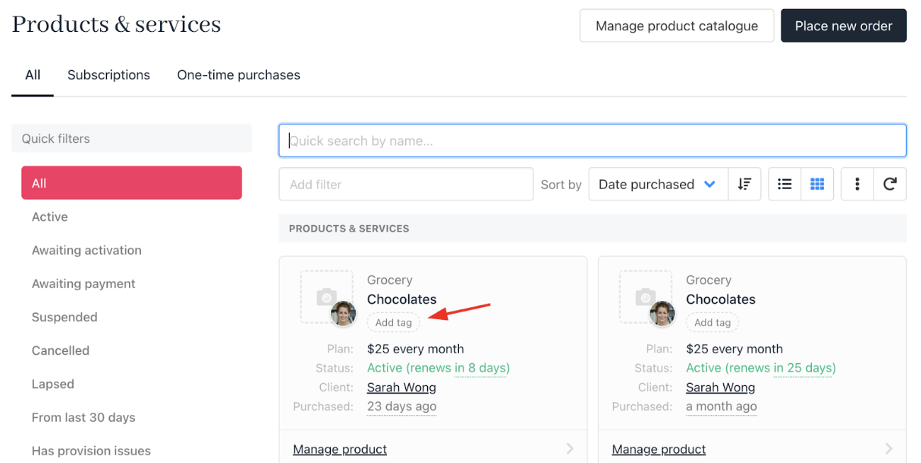Just like client tags, contract product tags help you segment and filter products easily within Upmind.