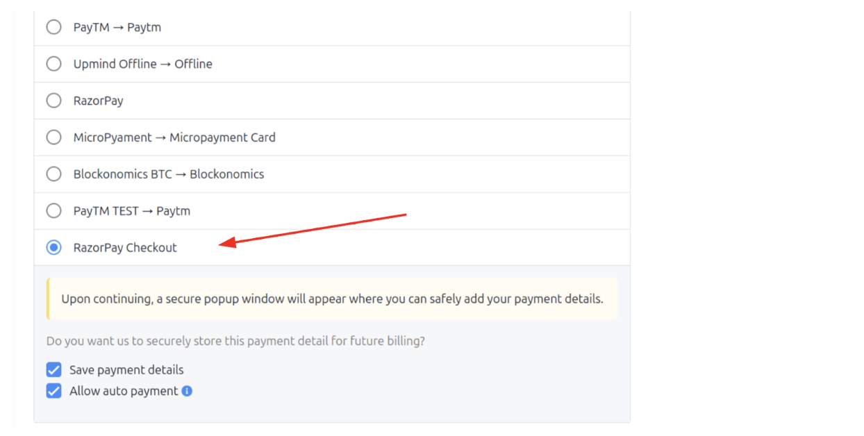 If the customer wants to pay with other payment methods, such as Bank, UPI, or a card without storing it for auto-payment, they should unselect Save payment details. The difference here is that Upmind cannot use cards stored this way for auto-payments.