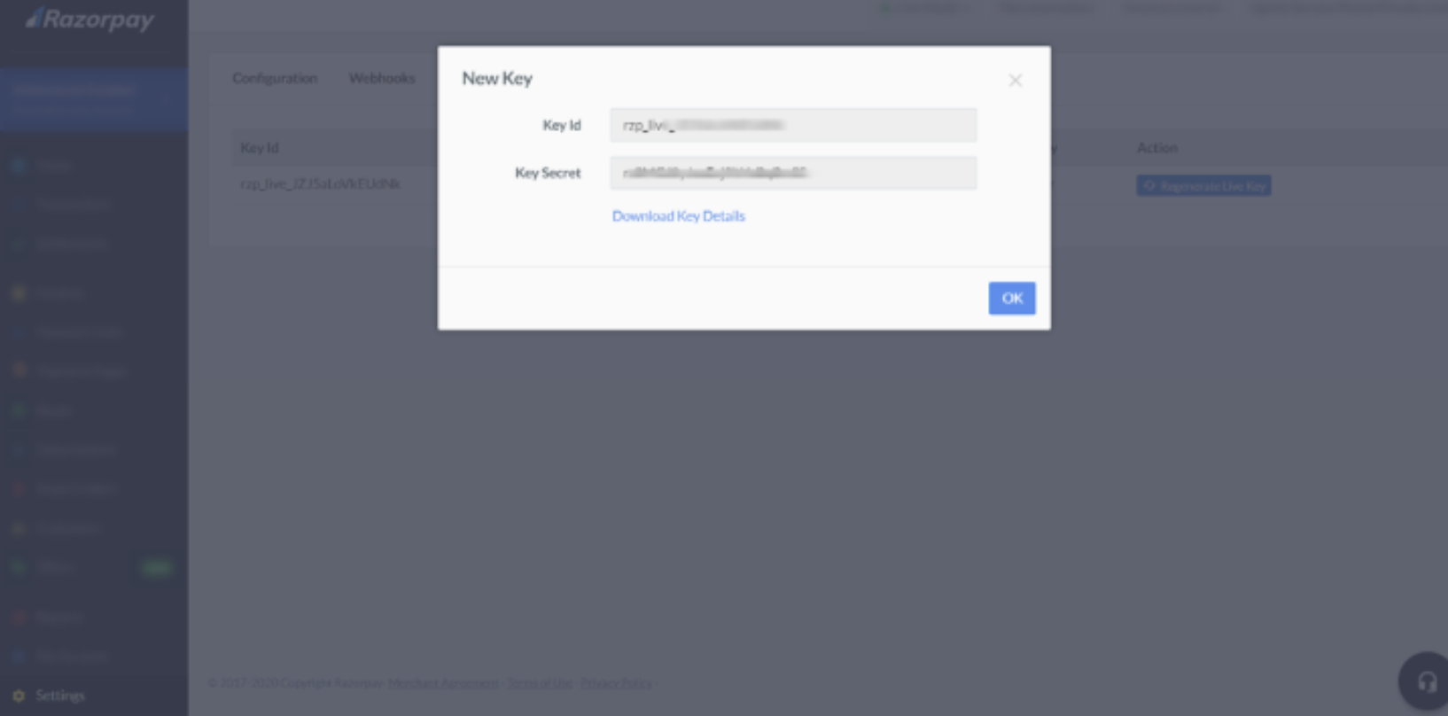 - Go to Accounts & Settings > Settings > API Key and click Regenerate Key to obtain your Key ID and Key Secret.