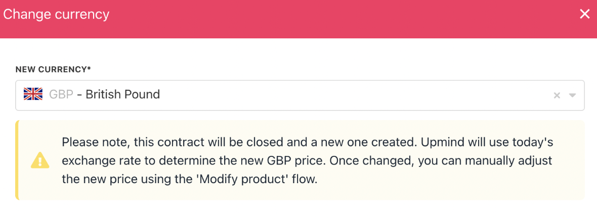 Admins and staff can update the billing currency for any contract product in Upmind.