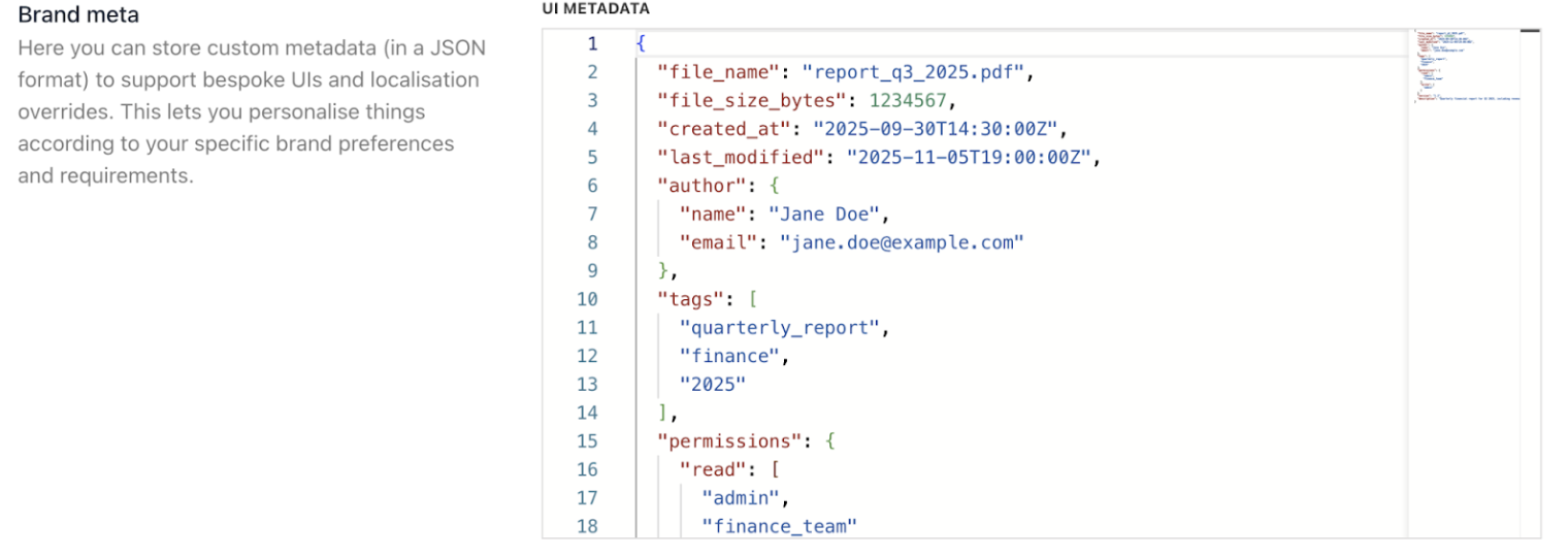 UI metadata: Defines how the interface is labeled, organised, and structured to look and behave consistently across devices. This includes text labels, menu names, button captions, and data schemas in a machine-readable format (in a JSON format) so the UI can render consistently.