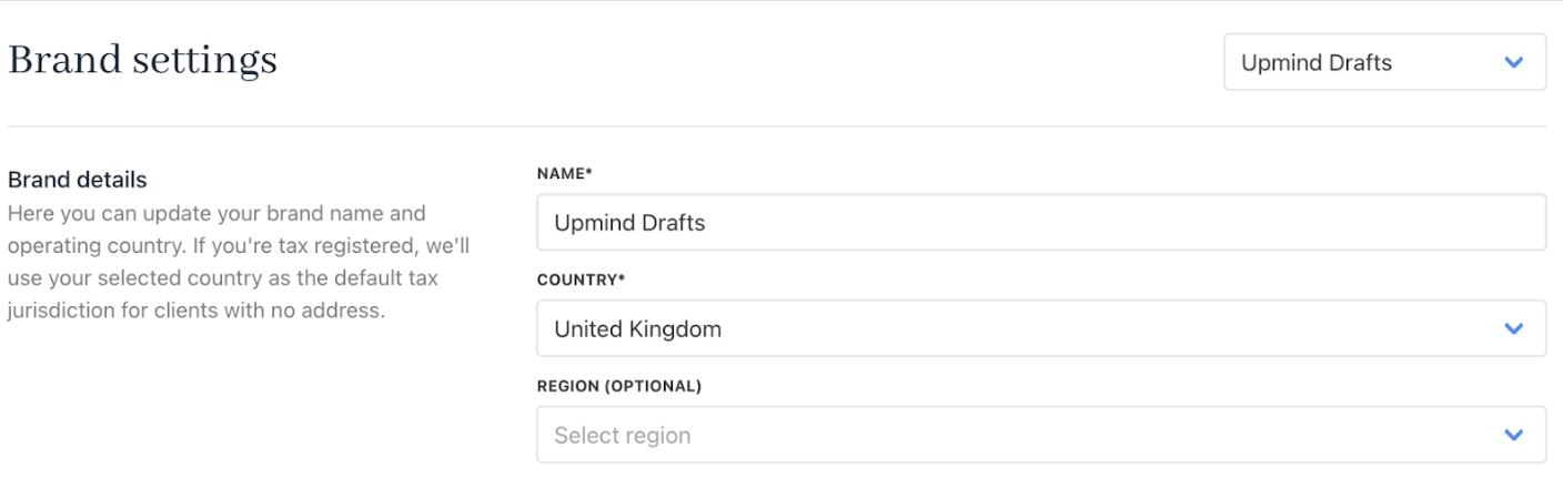 - Country: Set the brand’s base country for tax and compliance calculations, with an optional regional setting.