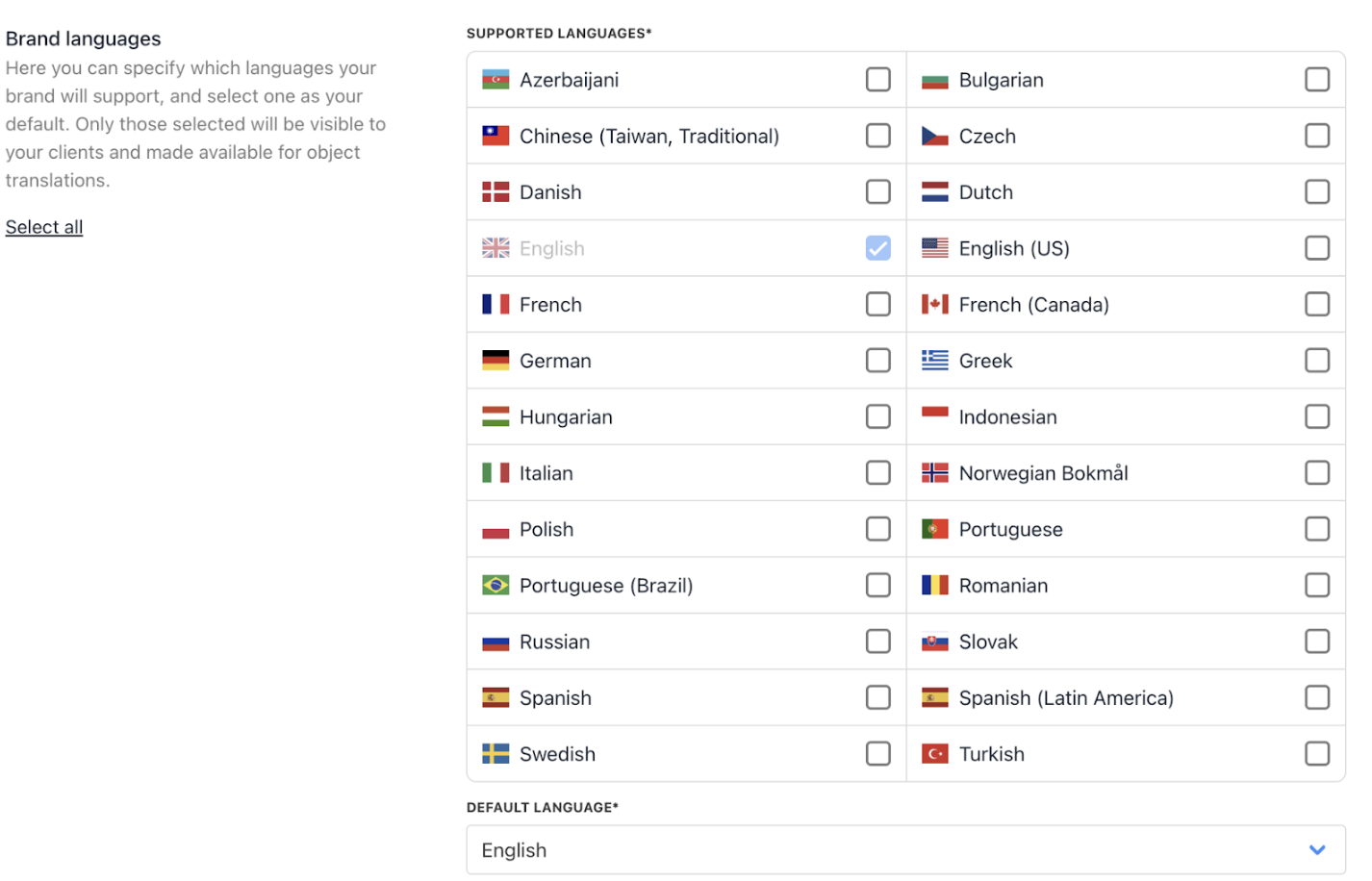 - Supported Languages: Add optional languages your clients can use on their account pages. English is the default.