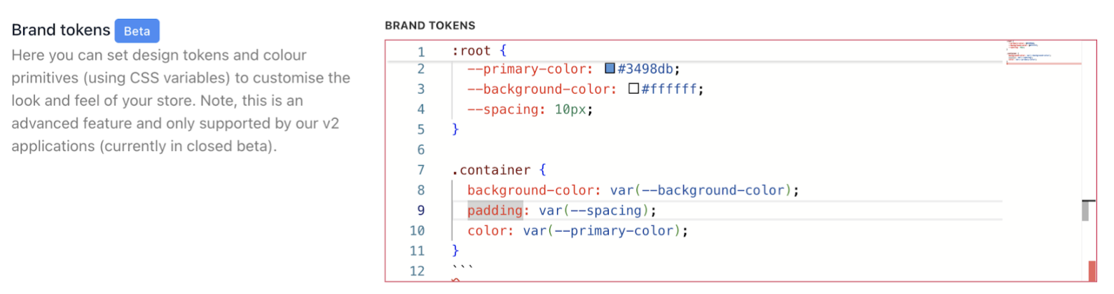 Design-system building blocks that store brand values (color, typography, spacing) and drive consistent styling across products (using CSS variables). This is currently in closed beta.