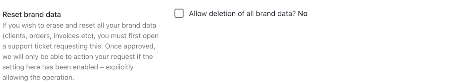 Allow deletion of all brand data: Enable/disable option to permanently remove all brand-related data.
