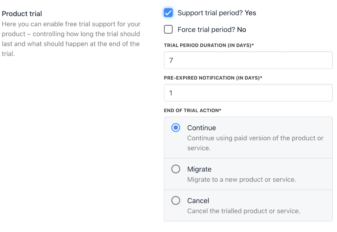 - Continue (default): The product continues as usual after the trial. There will be a charge after the tri,al and the price may change.