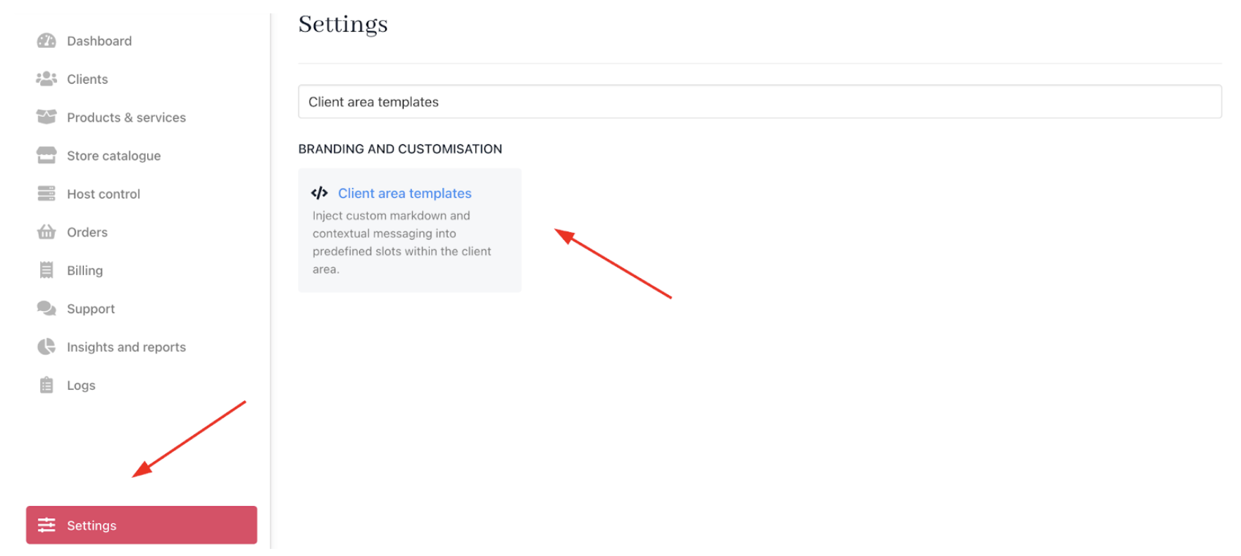 - Go to Settings > Client Area Templates under Branding and Customisation.
