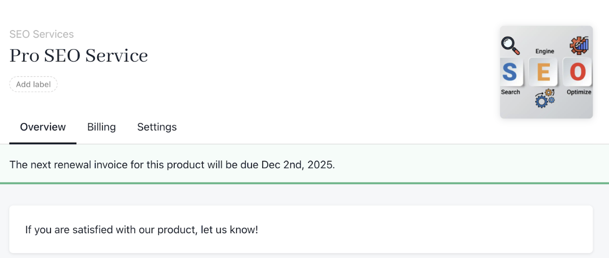 Messages linked to products appear on the product summary under Active products & services on client overview pages.