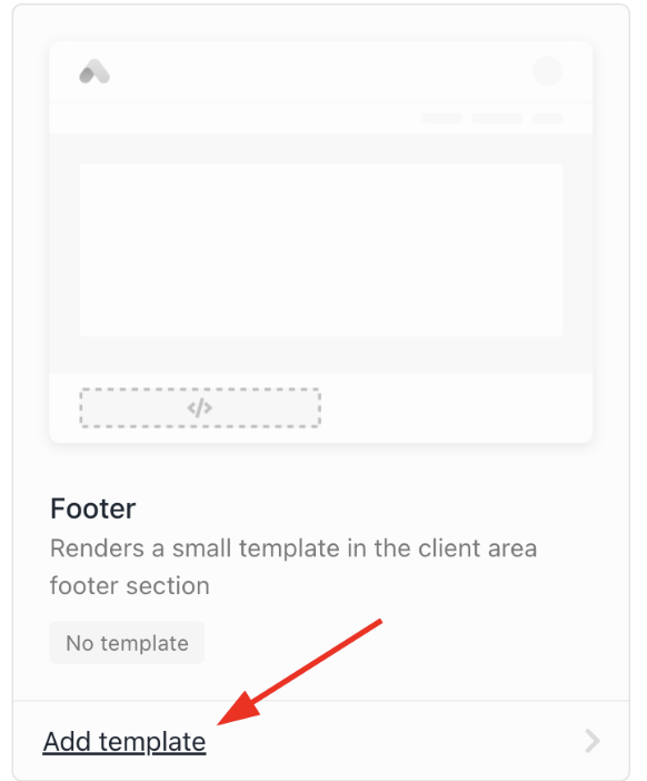 The Client area templates page shows slots. These slots are predefined areas in the client interface (e.g., Footer, Login page, Register page, Support Overview). You can either create a new template and assign it to a slot or prepare a custom template for a specific use.