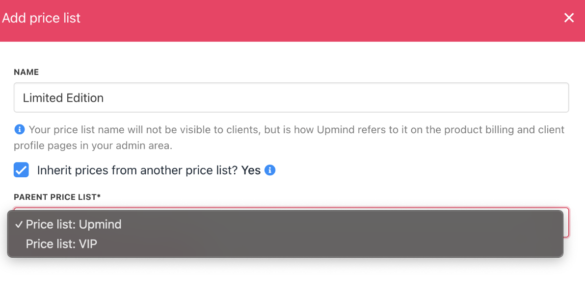 When creating a new price list, you can choose whether to inherit prices from another list: