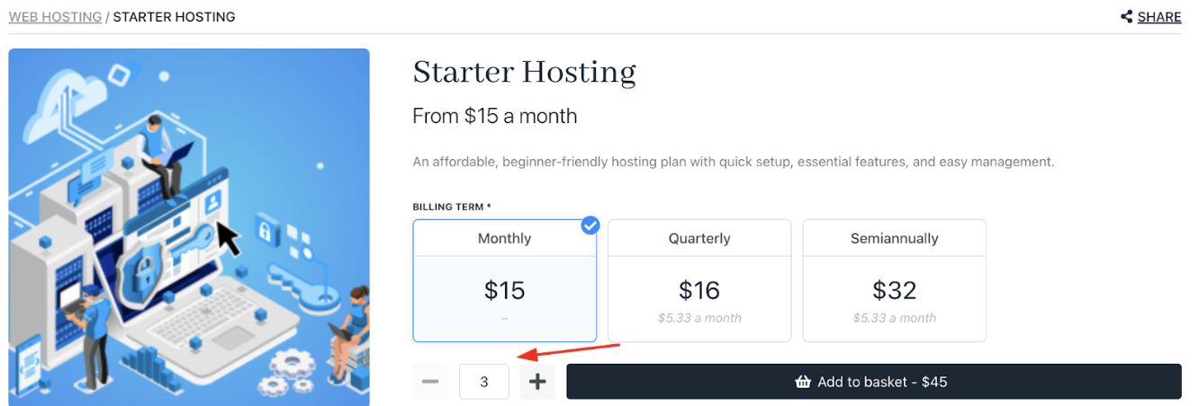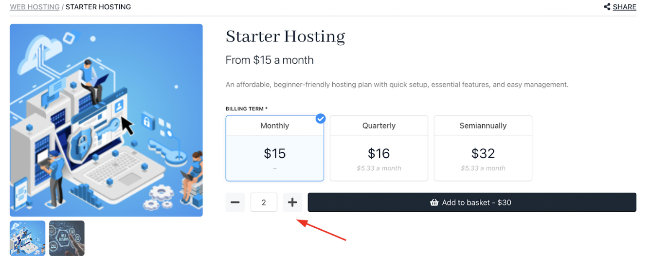 On the order page, the minimum quantity reflects this setting, and quantities increase or decrease by these increments when customers use the plus (+) or minus (-) buttons.