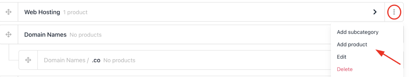 page. - Or, click the three-dot menu next to a category and select Add product.