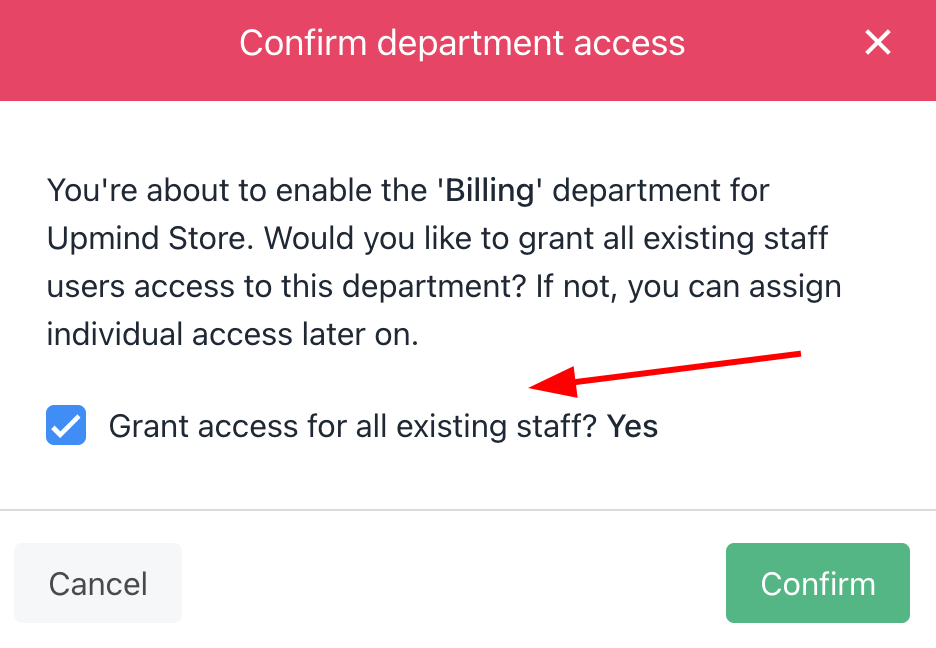 - When you toggle the button, you will see the option to grant staff access when enabling support departments.