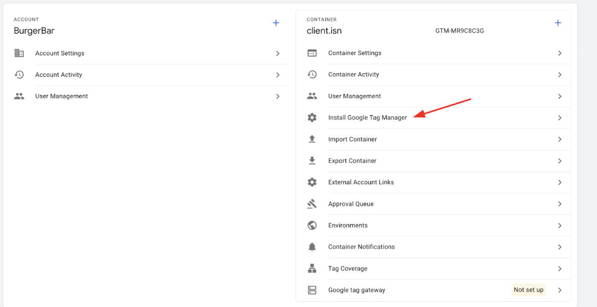 column, click on Install Google Tag Manager. This opens a popup displaying the GTM installation code snippets needed on your website.