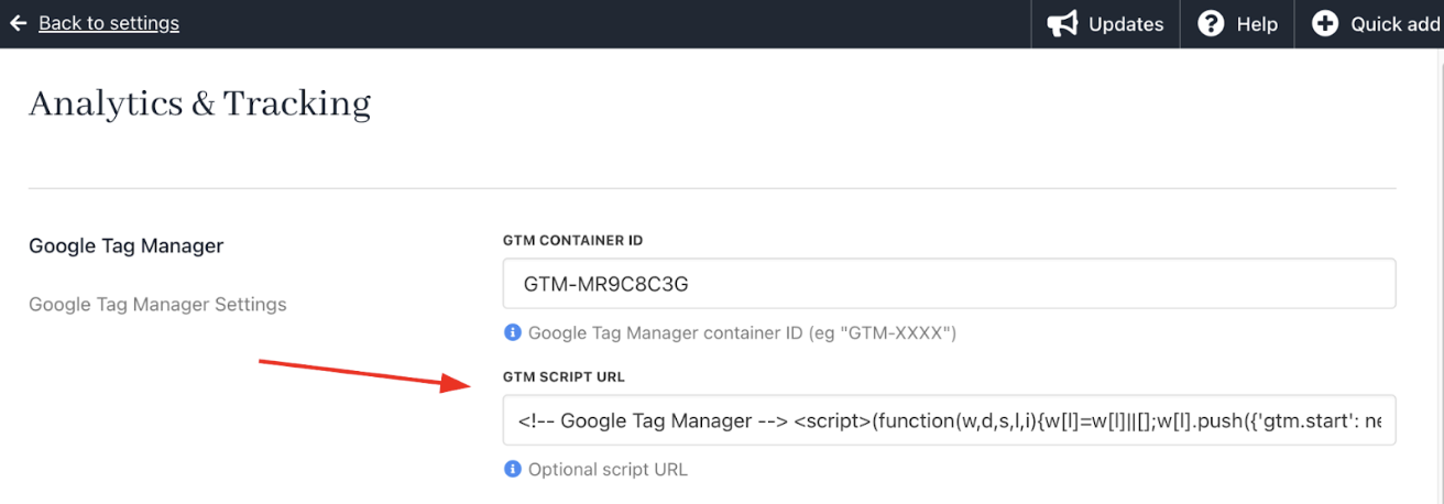 section. Paste the copied GTM script URL into the custom GTM Script URL field.