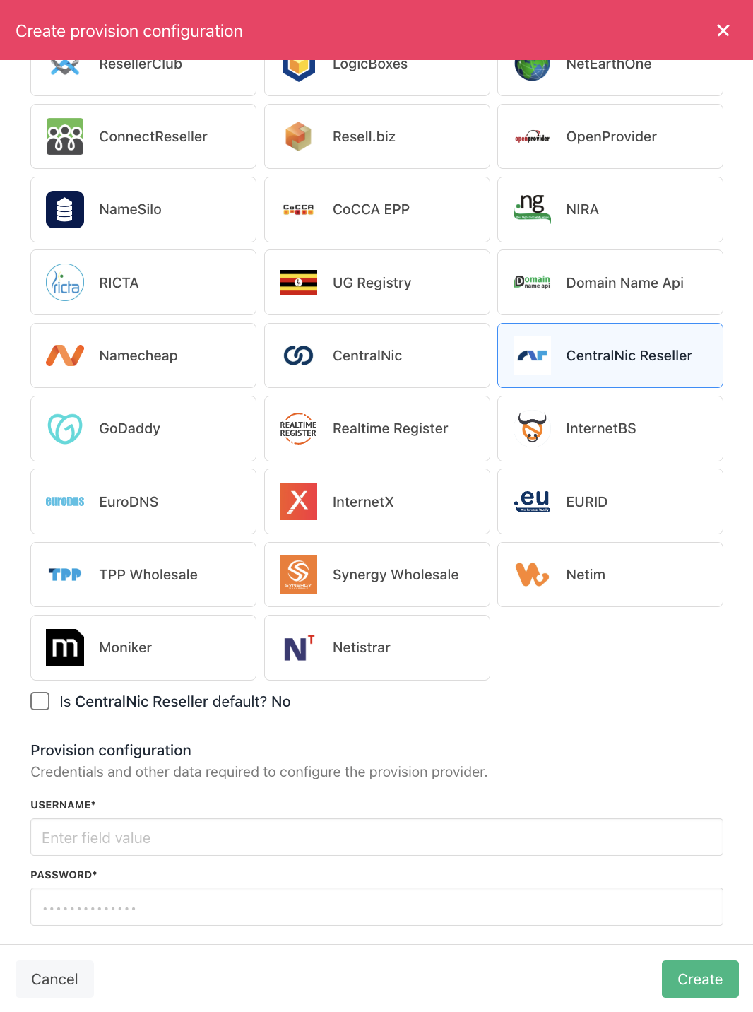 - In the modal that opens, enter the provider name. This name will not be visible to your clients. We recommend using "CentralNic Reseller" unless you need to distinguish between two separate CentralNic Reseller accounts.