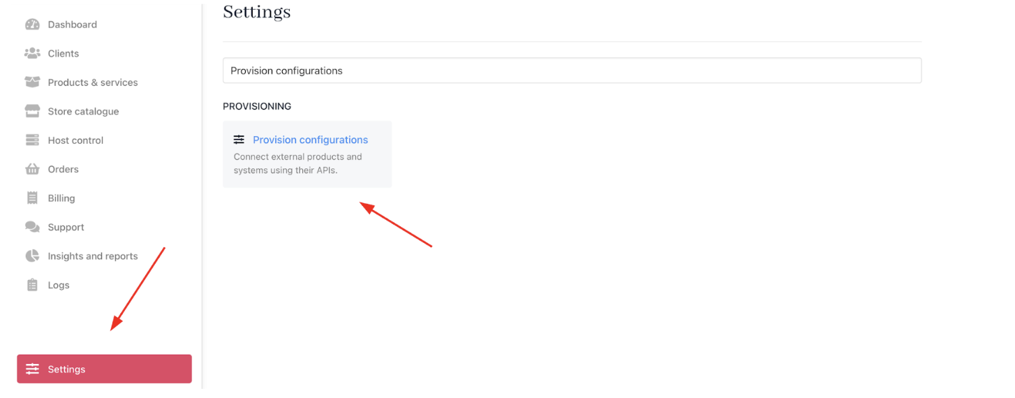 - In Upmind, go to Settings > Provision Configurations.