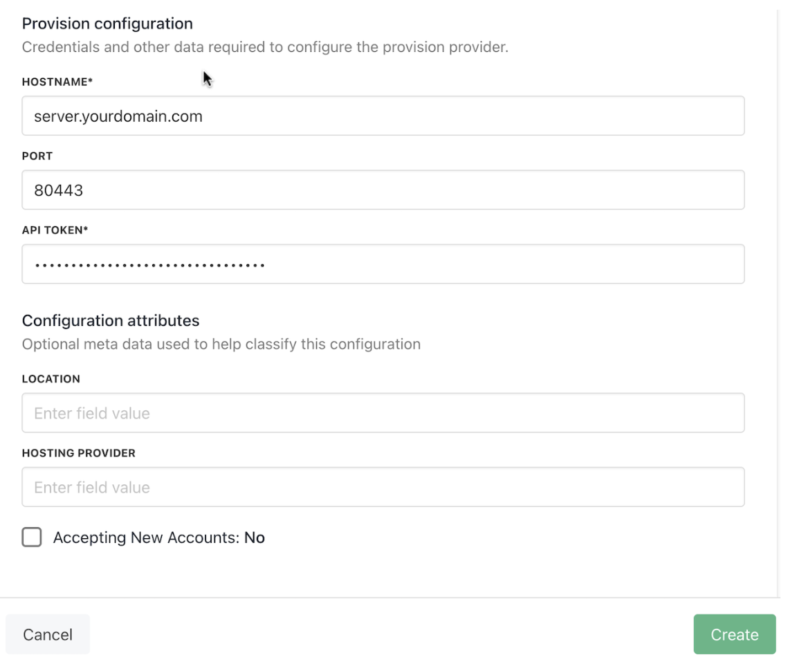 - Fill in any Configuration Attributes, such as hosting location and hosting provider.