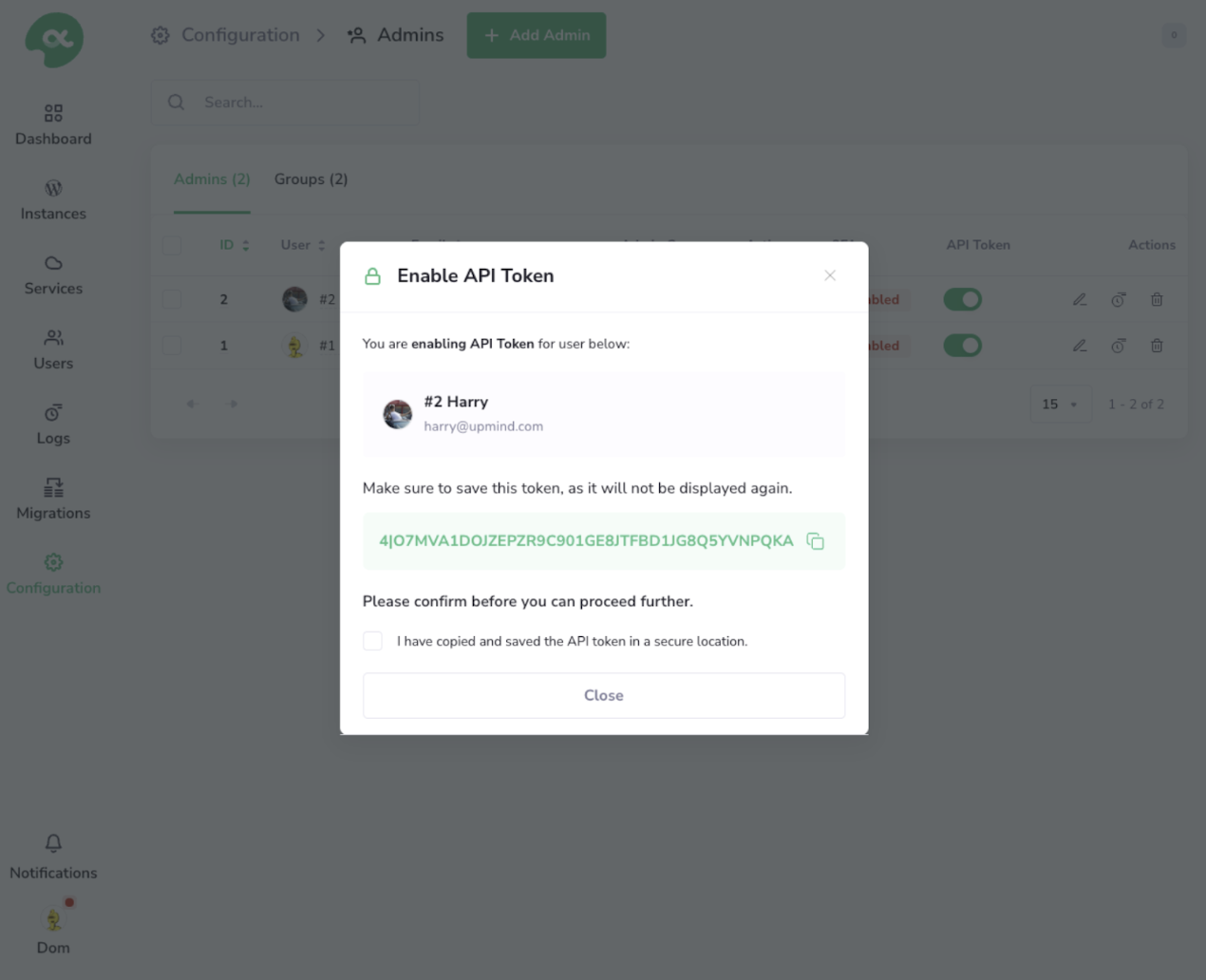 - Within the PanelAlpha admin dashboard, go to Configuration > Admins.