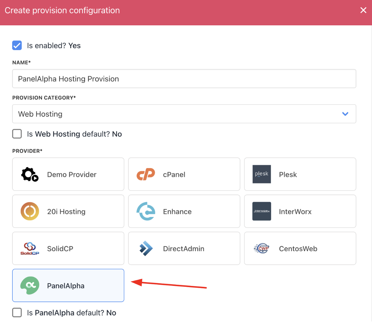- Choose PanelAlpha as the provisioning provider.