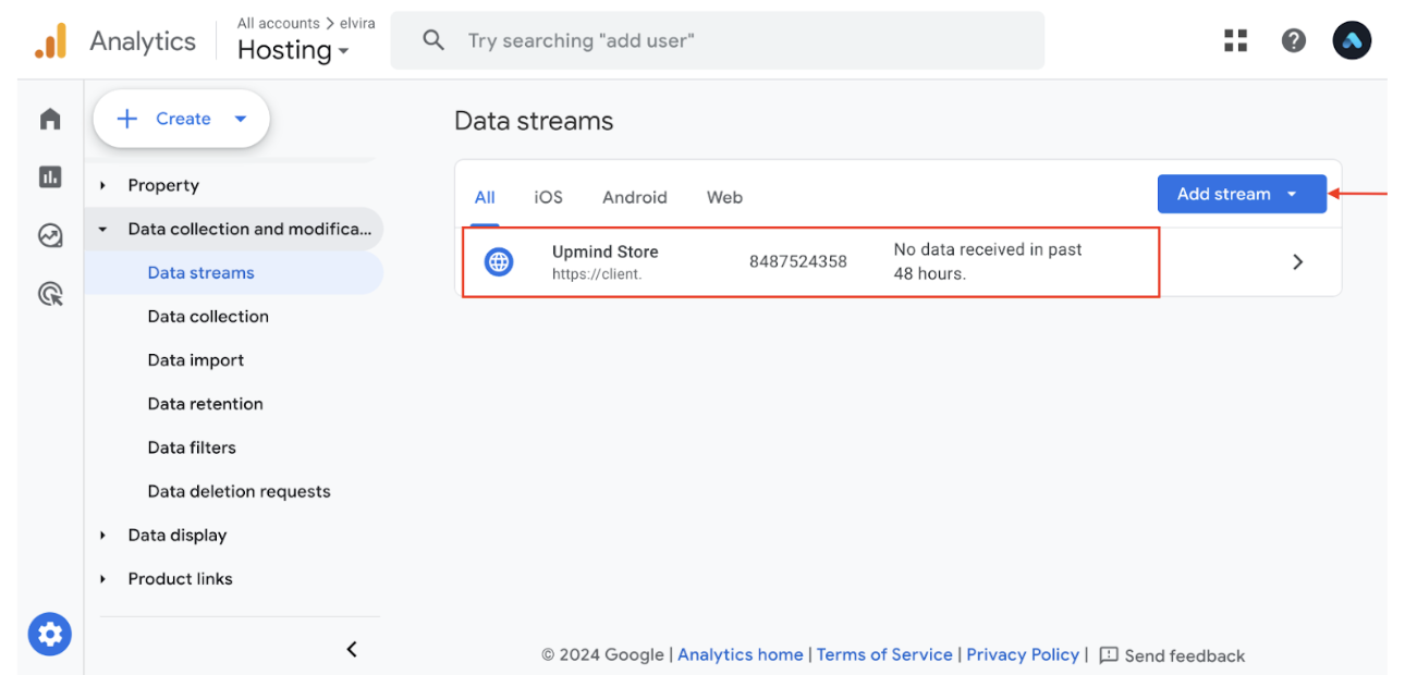 - Choose an existing web data stream or create one by clicking Add Stream, entering your website URL, and naming the stream.