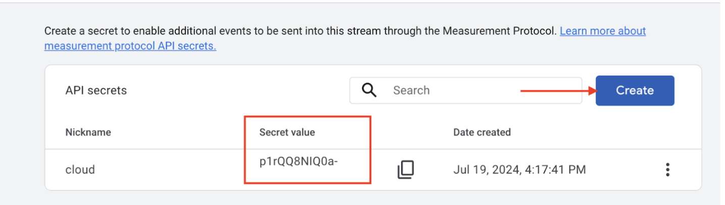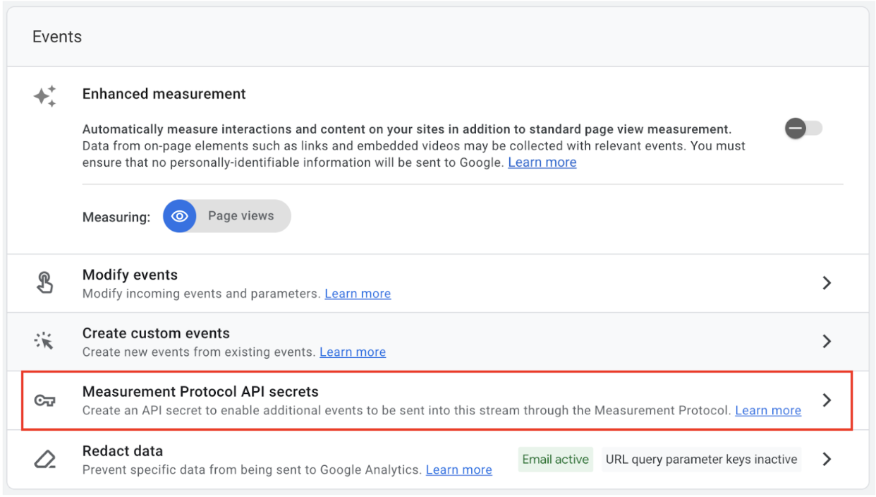 - In the Events section of the stream detail page, click Measurement Protocol API Secrets.