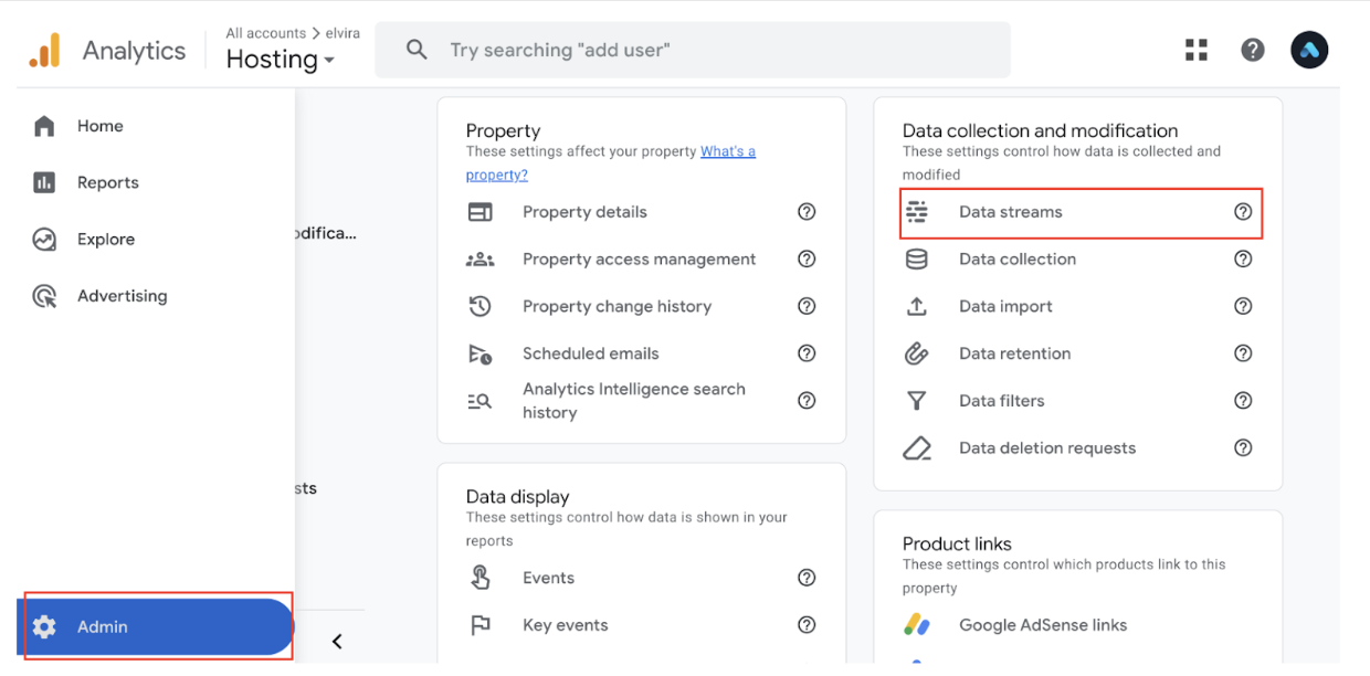 - Go to Admin and under the Property column, select Data Streams.