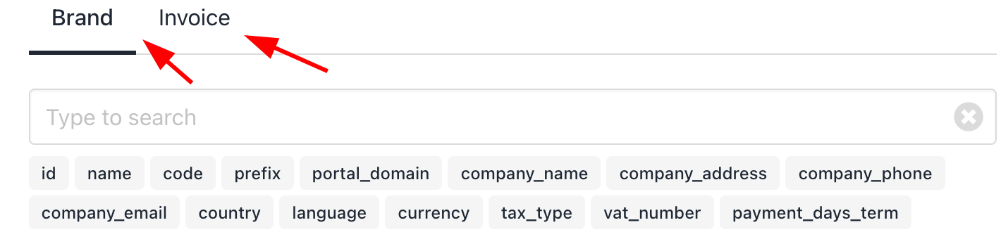 - Two tabs, Brand and Invoice, appear at the bottom for easy access to code snippets. Copy snippets by clicking their label and paste them where needed in the template.