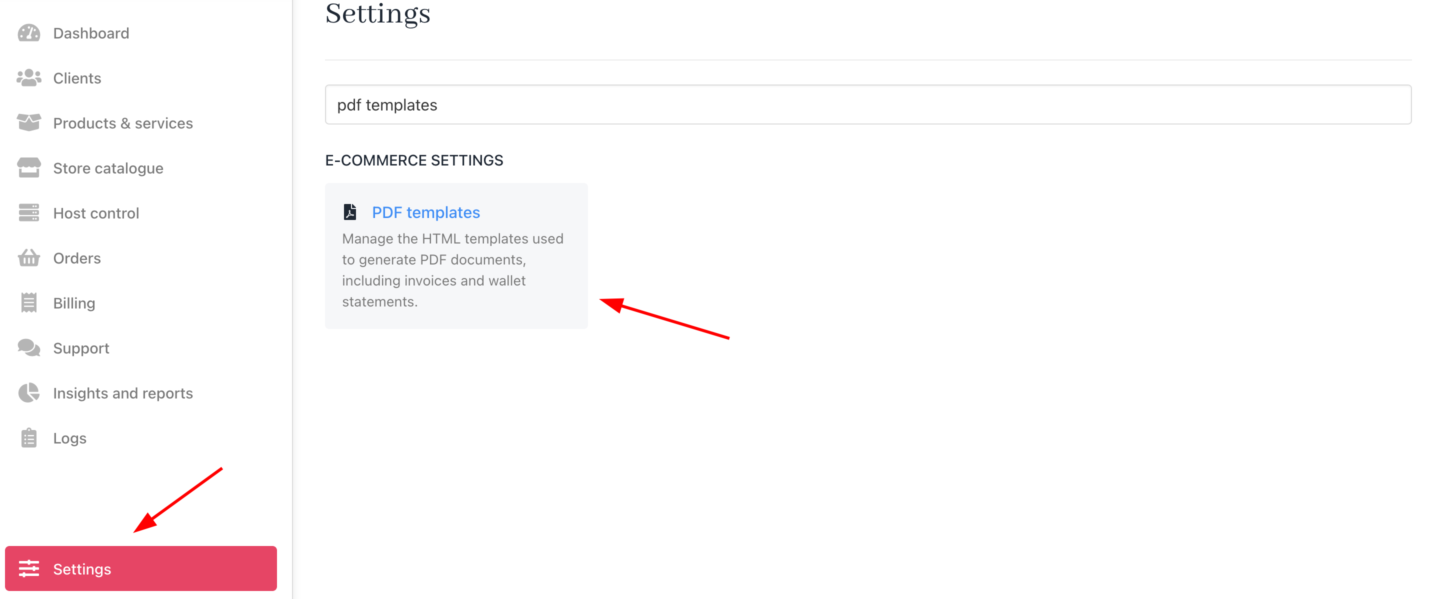- From Settings, go to PDF Templates under E-commerce Settings.