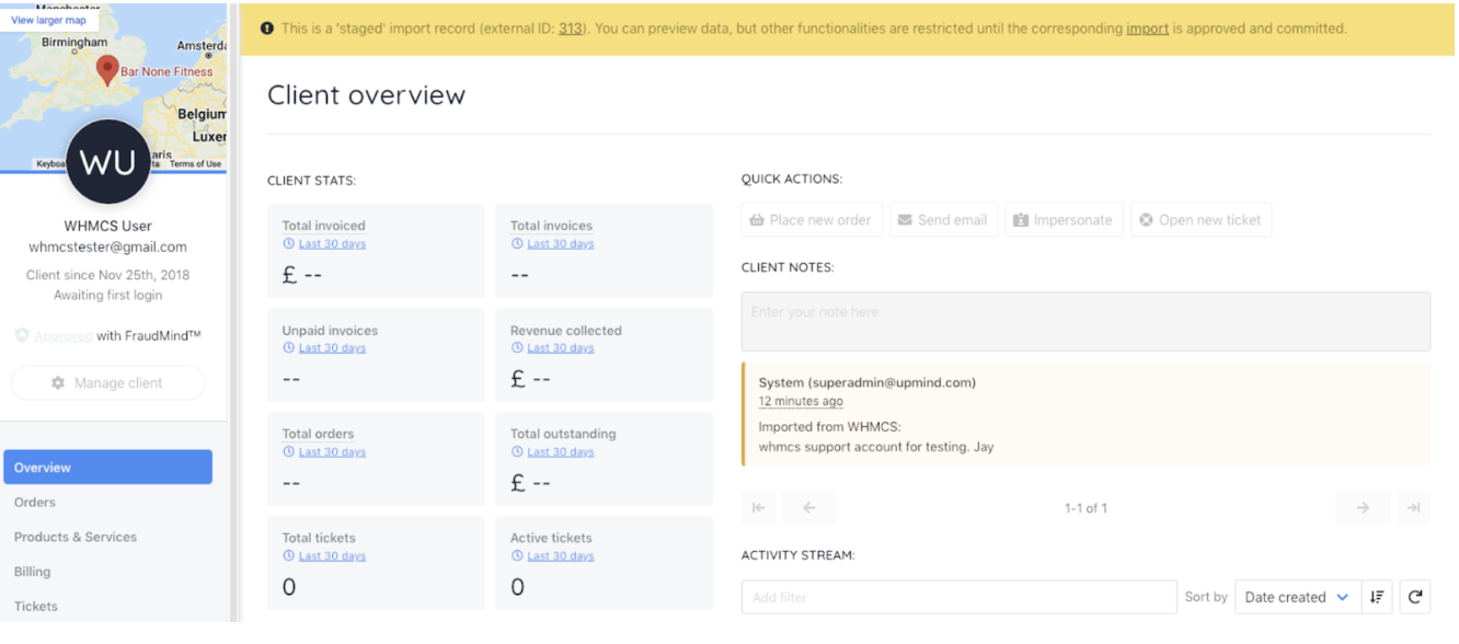 Upmind supports importing most core WHMCS data, including: