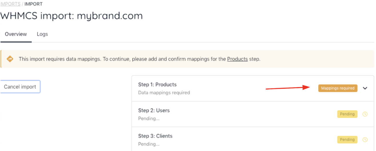 After the first import, you'll see an orange Mappings required notification.