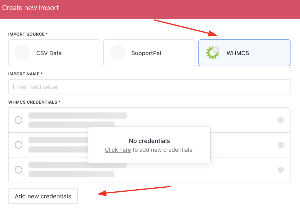 - Click Create New Import and select WHMCS.