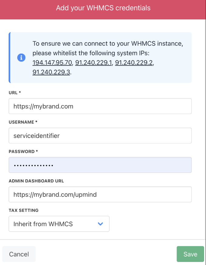 - Add the URL, Username, Password, Admin Dashboard URL, and choose the Tax Setting collected from WHMCS.