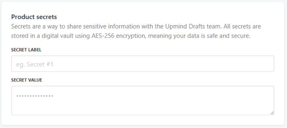 - Secret Value: The actual sensitive data, such as passwords or tokens, is stored securely and encrypted by Upmind. Only authorised users can access or use the secret, protecting your business and client data at all times.