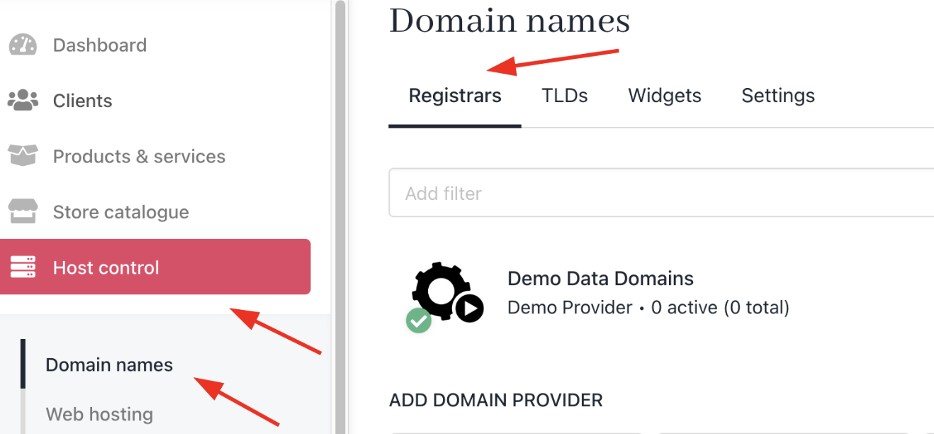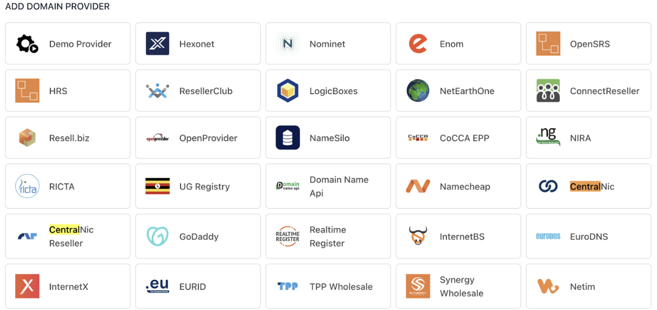 - Add Registrar Providers you work with (e.g., Hexonet, CentralNic, ConnectReseller).
