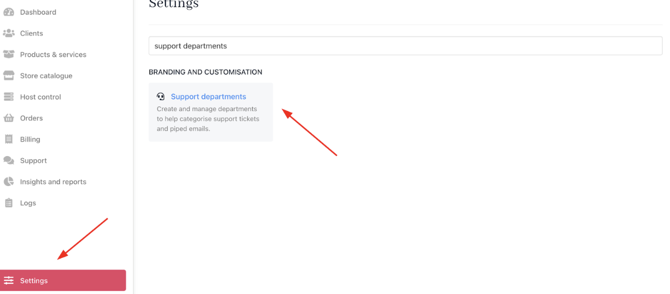 - You can configure email piping for support tickets by going to Settings > Support Departments under Branding and Customisation.