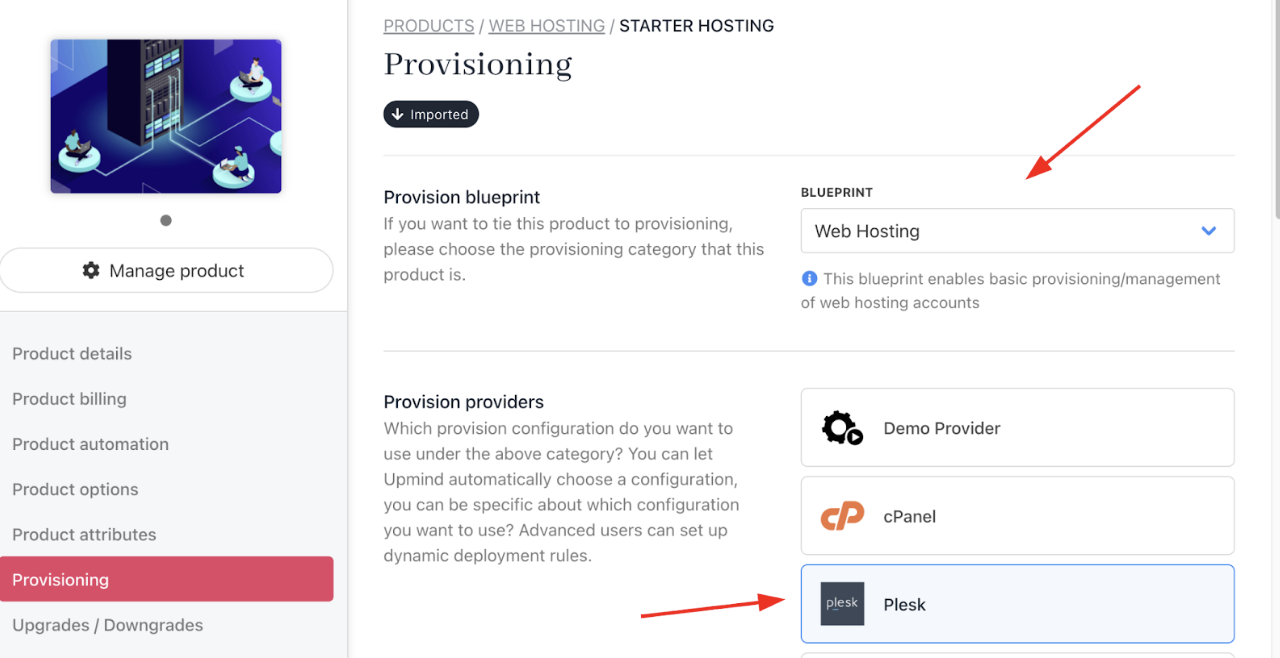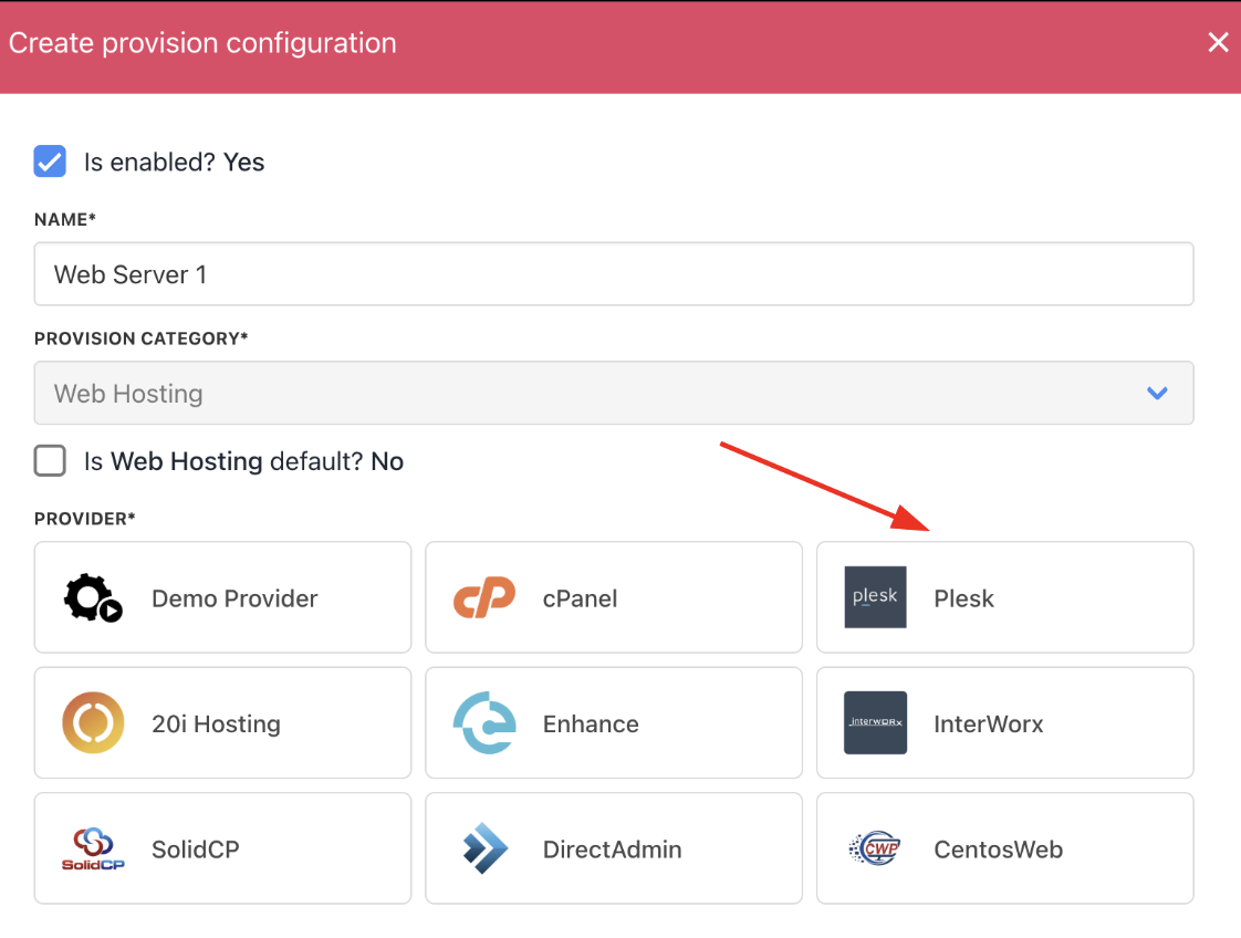Plesk. - You can create and provision a Web Hosting service on Host Control > Web Hosting from the Admin Dashboard or Settings > Provision Configurations under Provisioning.