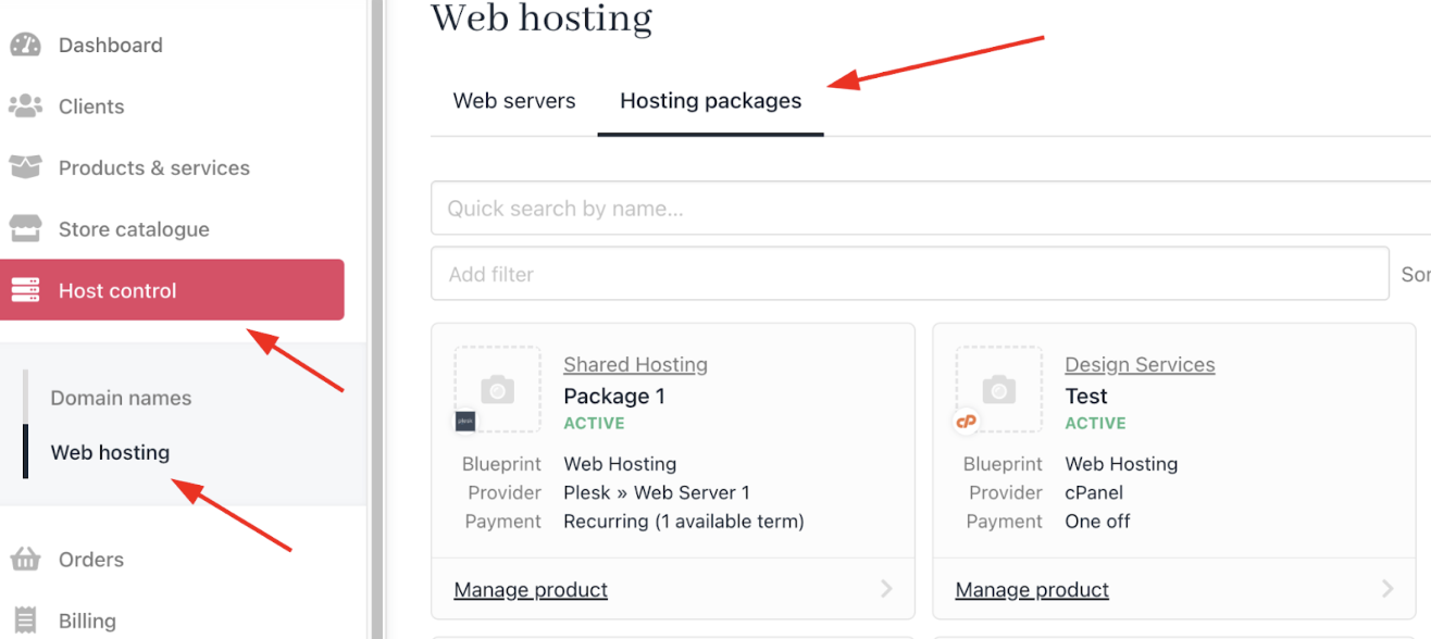 - Go to Host Control > Web Hosting > Hosting Packages.