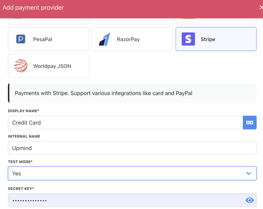 - Click Add payment provider and configure payment gateways like Stripe, PayPal, or offline payment methods.