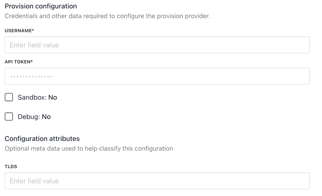 - Enter Provision Configurations, such as account credentials and API keys, to enable automated domain registration and management within Upmind.