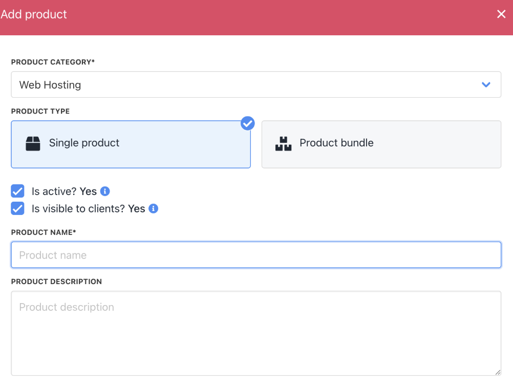 - Create a new Product Category or choose an existing one. Then choose product type, product name, and a description.