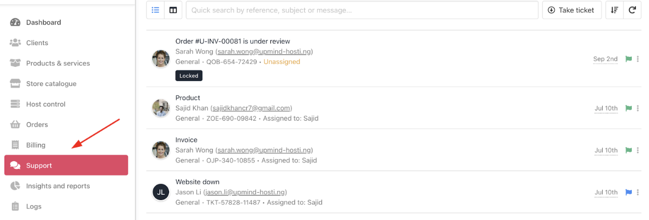 - You can also implement Upmind’s built-in ticketing system to handle customer inquiries or technical support. Tickets link to client records for holistic case management.